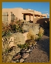 Front Yard - A source of changing beauty throughout the four seasons in this high desert locale Casa Vista's front yard employs xeric plantings, from native bunch grasses and sage to perennial flowering species accented by yucca, cacti and agave. Nestled in among massive native sandstone boulders low growing Junipers, Mugo Pines, Ephedra, Genista, Russian Sage, ornamental grasses and many other interesting plantings make this low-maintainance yard a pleasure year-round. Extensive low voltage lighting (bollard, mushroom, flood and spot fixtures) highlight the plantings and front architecture and extend the enjoyment of the landscaping through the evening hours. Two broad entry walkway/parking pads leading to the north and south entry portico entries are located on either side of the front yard for the convenience of family, visitors and guests. The paving in the front yard is reinforced both with rebar and micro-fiber additive. Key-kold galvanized steel dividers create pads which are sized to greatly reduce the possibility of crack formation. An architectural scale welded sculpture ("Helical Zig-Zag") of Cor-Ten steel by the designer/owner accents the front yard and is available separately. |