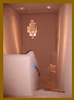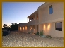 North Loggia and Patio - Extending the full depth of the structure on two levels the upper and lower north loggia, with a walled patio contiguous with the latter, provide shelter and access to the front yard, patio and rear plaza from all north entries and generous spaces usable for outdoor enjoyment, entertainment, and display of both free-standing and wall mounted artworks. The north side location is particularly pleasant in the warm summer months with covered loggia and north front retaining wall providing welcome shade in the afternoon hours. The upper loggia, adjacent to the student/office suite and master suite, is floored with ceramic tile as is the exterior staircase connecting the upper and lower loggia. The exterior staircase contains a covered skylight, recessed wall washer lighting and lighted nichos. Both upper and lower levels have recessed and adjustable spot fixtures to provide architecturally dramatic and flexible lighting in these areas. The lower loggia and patio flooring is of Palomino colored exposed aggregrate concrete. This area provides a generous space for outdoor entertainment, with electrical and gas utilities and stereo speaker outlets (connecting with the media room entertainment center) provided. The lower level galley kitchen is conveniently reached nearby through the vestibule entry of the family/media room, which opens to this area. Nichos in the end wall of the lower loggia adjacent to the patio area provide additional space for display of three-dimensional artworks and craft items. A unique architectural feature of Casa Vista is the dual over/under glass block accent windows at the northeast corner of the loggia. Backlit by either the installed incandescent spotlights or digitally controllable Color Kinetics specialty fixtures these windows provide a distinctive landmark in the neighborhood, day or night. |