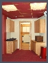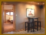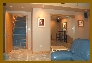 | Vestibule/Game Room - An arched opening in the north wall toward the rear of the family/media room is closable with a cellular horizontal blind matching the wall units described for the family/media room. This doorway leads to a vestibule/game room. This bonus room, with ceramic tile flooring, provides many square feet of wall space, lit by recessed lighting above, for display of artwork. A full length built-in credenza on the wall opposite the interior door provides enclosed storage and a top ideal for display of small three-dimensional art and craft items. This room can easily accomodate a gaming table and chairs (bridge, poker, ma jong, etc.), excercise equipment, or the like. An eight foot wide glass bypass sliding door in this room leads to the exterior lower north loggia and patio. An additional Color Kinetics digital accent light is installed in the ceiling of the loggia recess immediately outside the sliding door to provide dramatic nighttime accent lighting to this entertainment area. |