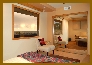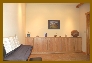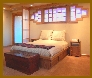 | Guest Bedroom - Located at the northeast corner of the lower level the guest bedroom is reached through the den. Opposite the bedroom entry door an exterior door with full light with integral mini-blinds provides access to the north lower loggia and patio. The same exterior wall contains a large three section glass block accent window of the same design found in the master bedroom and study in the upper level. A custom built-in Shoji screen adjacent to the door provides additional privacy and draft control when opening the exterior door. The east wall of the guest bedroom contains a large view window overlooking the rear plaza and views of the horizon, valley and bluffs. The wall separating the bedroom from the den contains a large reach-in wardrobe closet with installed closet furniture (rods, shelves, and drawers) included. Mirrored bypass sliding doors enclose the closet. Two circuit recessed lighting in wrap-around soffits provide dramatic lighting accents for the walls and built-in credenza (on the west wall). All windows are fitted with cellular horizontal blinds which disappear into oak valences when not in use. The bedroom is provided with a reversable ceiling fan. Adjacent to the passage door between the den and bedroom is a door leading to the guest bath (also accessable from the lower hall). |