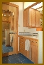 | Mudroom - Located beween the lower hall and garage, the tile floored mudroom is extensively outfitted with built-in upper and lower cabinets with laminate countertops. A large 42 inch wide cabinet is suitable for storage of large or bulky items, e.g. sports equipment (golf bags and clubs, etc.). A built-in pet door on the outside wall of the mudroom will accomodate animals up to standard American Collie or German Shepherd size. A security slide on the inside of the flexible pet door allows prevention of unwanted pet egress or ingress when desired. The exterior wall also contains a sliding glass patio door leading to the lower rear loggia. A pass-through to the galley is on the wall opposite the exterior wall. Opposite the lower hall entry to the mudroom is the door leading to the two car garage and home workshop area, with the high bay two car garage beyond. A custom designed padded boot bench in the mudroom is included with the purchase. |