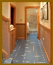 Stair and Lower Hall - The lower level of the residence is reached by descending the interior staircase through a lockable solid-core door located in the main entry hall. The staircase and lower hall utilize a solid blue ("Denim") colored tile flooring that provides a color accent to the mocha and cream wall colors. A solid oak chairrail separates the mocha color below from the cream color above in both the stairwell and lower hall. The stair nosings are solid brass extrusions that provide highlights that sparkles in this well-lit space. The staircase is designed as a mini-gallery space with both custom lighting soffits and track lighting. An oak framed display space above the descending stairs provides an ideal location for art or craft items, e.g. a Navajo rug. The walls of the stairwell are lit by the track lighting to provide additional hanging space for art works. The lower hall contains a built-in credenza and recessed lighting and provides access to the guest suite, guest bath and family/media room and mudroom. The lower level of Casa Vista, including a galley kitchen, is potentially a living space independent from the upper level, e.g. an "in-law" residence or fully contained guest suite. |